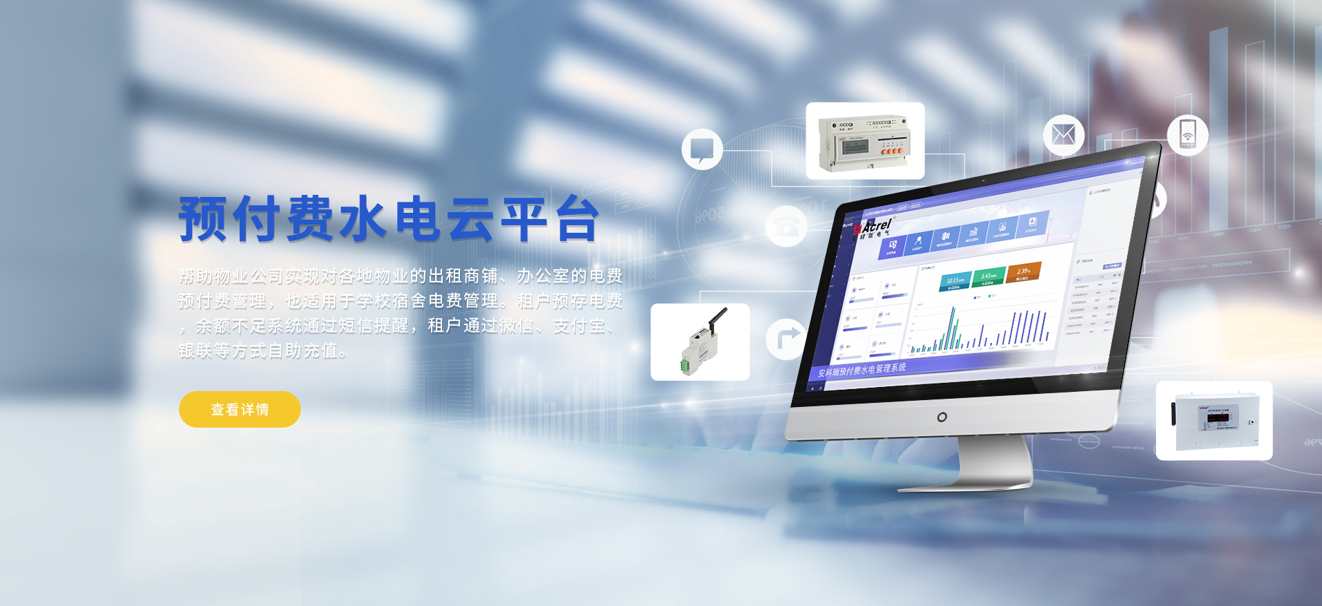 安科瑞提供的解決方案包括Acrel-EIoT能源物聯網云平臺、變電所運維云平臺安全用電管理云平臺、環保用電監管云平臺、智慧消防云平臺能源管理云平臺、工業企業能源管控平臺、遠程預付費云平臺、餐飲油煙監管云平臺電動汽車/電瓶車充電樁收費管理云平臺、電力監控/無線測溫系統、電能質量治理系統、電氣火災監控系統消防設備電源監控系統、防火門監控系統應急照明和疏散指示系統、智能照明控制系統、醫用隔離電源絕緣監測系統等,幫助用戶實現能源智能化、可視化、精細化管理,提高用能效率和用能安全,為企業節能降耗和實現能源數字化建設提供數據服務。